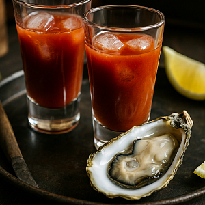 Устрицы разложите по шести рюмкам. Залейте водочно-томатной смесью. Украсьте сельдереем и сразу подавайте. Прекрасное настроение и незабываемые впечатления обеспечены!